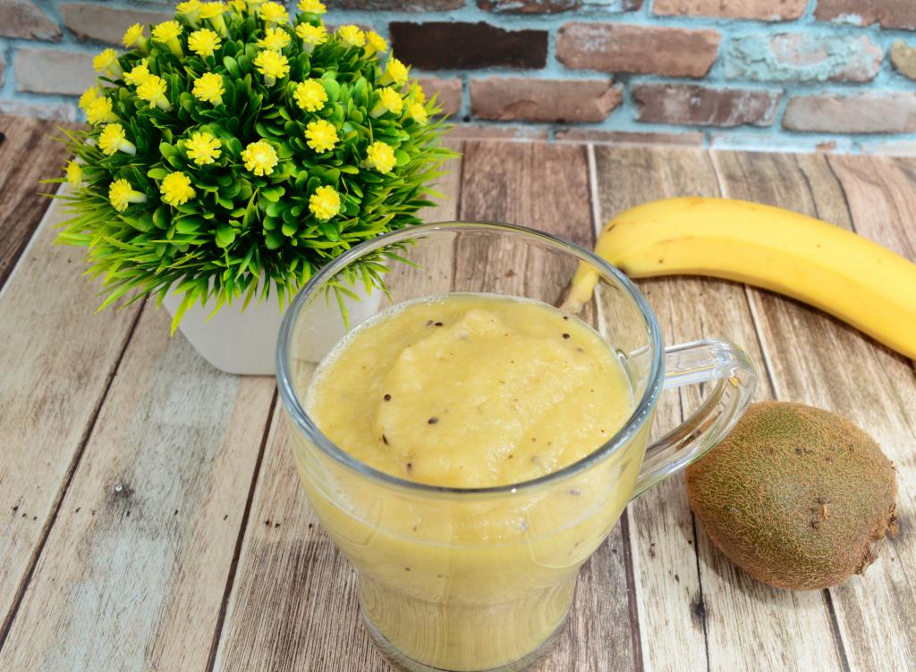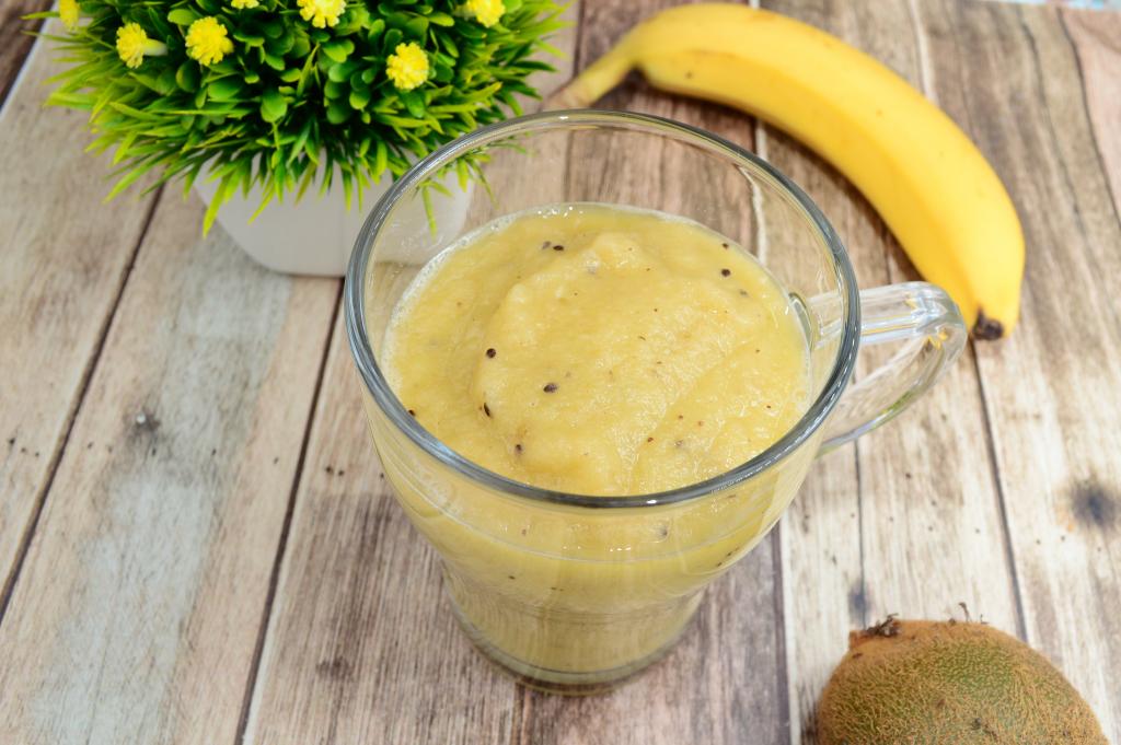 Вкусный, нежнейший смузи из банана, киви и яблок готов, сразу разливаем его по чашкам и наслаждаемся полезным напитком.