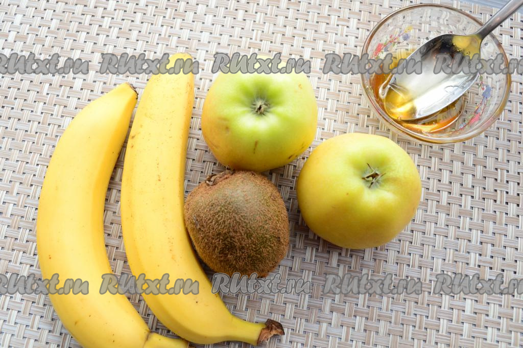 Подготовить фрукты и мёд. Бананы и киви лучше брать спелые. Яблоки берите те, которые вам больше нравятся или есть в наличии. Смузи из кисло-сладких яблок приобретёт кислинку, которую, при желании, можно устранить, добавив мёд. Я взяла сладкие яблочки.