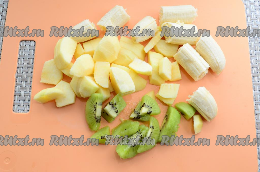 Бананы почистить и поломать на крупные кусочки. Яблоки и киви очистить от кожуры, нарезать фрукты на средние кусочки.