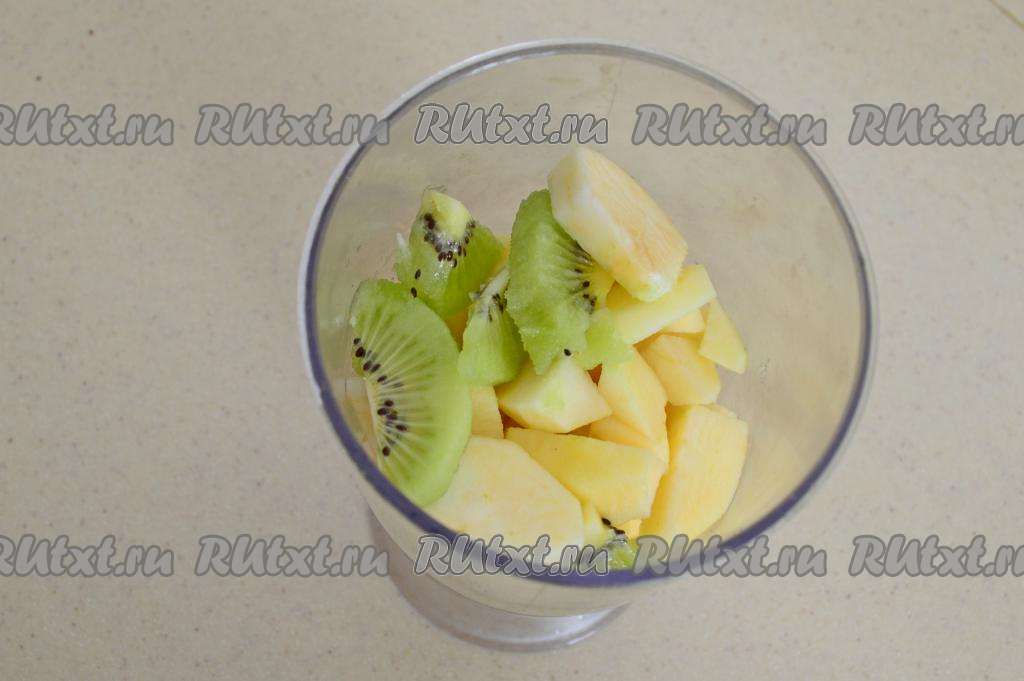 Выложить в чашу погружного блендера сначала бананы, затем уже яблоки и киви. Яблоки достаточно твёрдые, пробиваются они сложнее, чем бананы и киви, именно поэтому их нужно выкладывать поверх кусочков бананов.