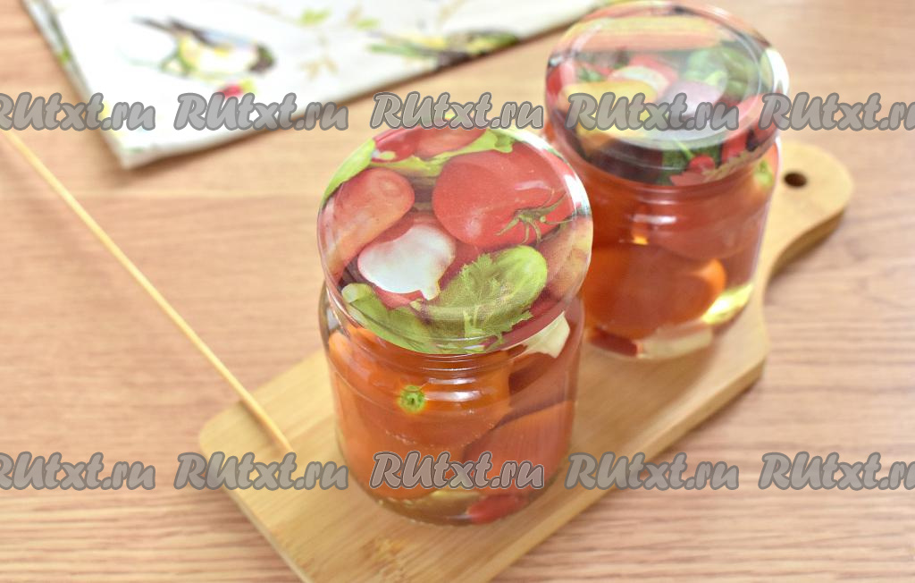 Маленькие помидоры прокалываем зубочисткой возле плодоножки (благодаря такому проколу помидорчики не лопнут). Заполняем банки маленькими помидорами и заливаем полностью кипятком. Банки накрываем крышками и оставляем минут на 10. Спустя это время воду из банок сливаем аккуратно в раковину.