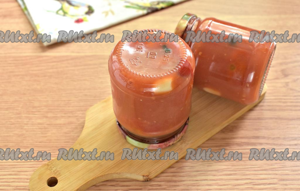 Томатный сок переливаем в ковшик (или казан), всыпаем 1 столовую ложку соли, ставим на огонь. После закипания варим томатный сок на небольшом огне 15 минут, периодически перемешивая и снимая пену. В конце приготовления добавляем в томатный сок уксус и перемешиваем.