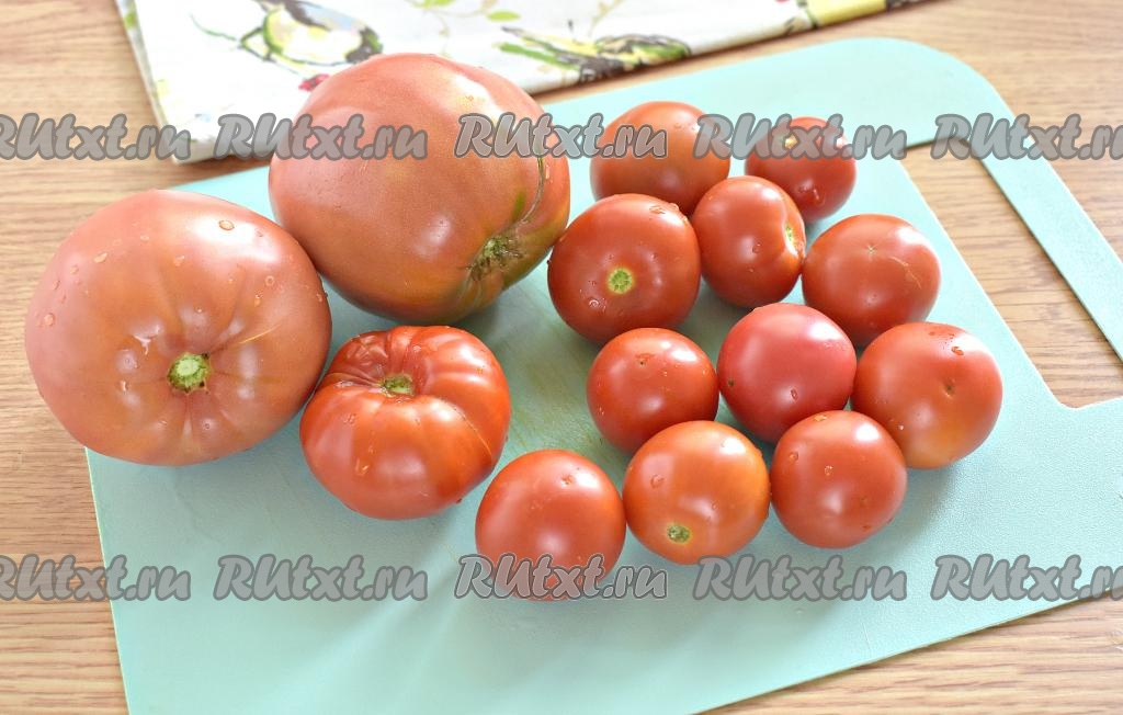 800-900 грамм крупных и мясистых помидоров будем использовать для приготовления сока, нарезаем их на небольшие кусочки, вырезаем место, в котором находилась плодоножка.