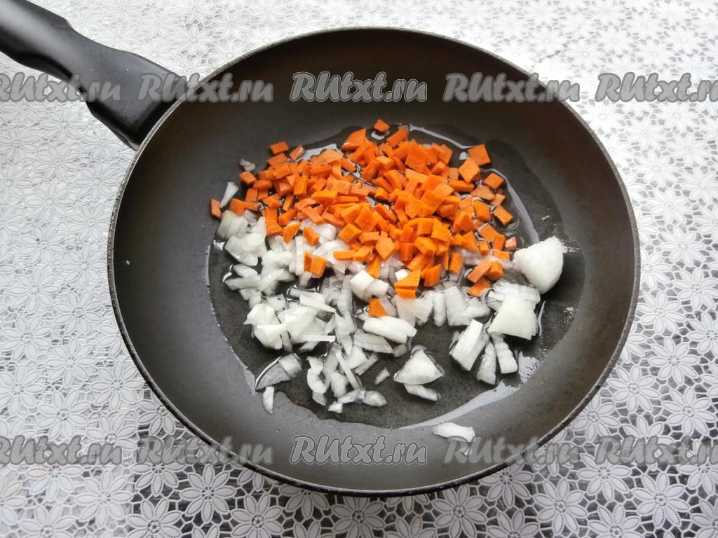 Лук и морковку очистить. В сковороде разогреть растительное масло, добавить нарезанный произвольно лук и нарезанную на небольшие кубики морковь.