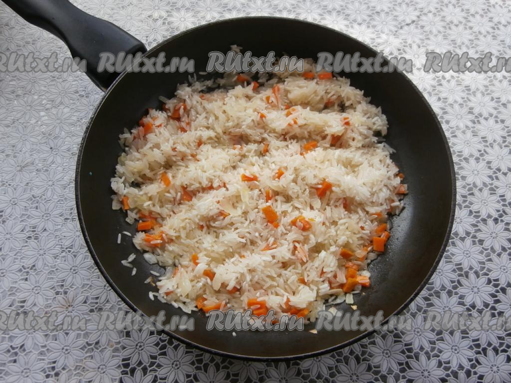 Обжарить овощи в течение 2-3 минут на среднем огне, помешивая, затем добавить к ним рис, перемешать.