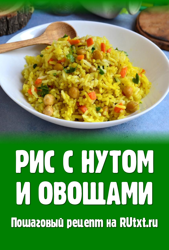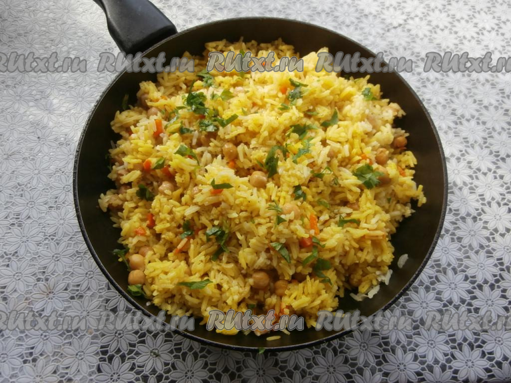 Обжаривать рис с овощами, помешивая, до испарения лишней жидкости и лёгкой румяности риса. Далее добавить варёный (или консервированный) нут.