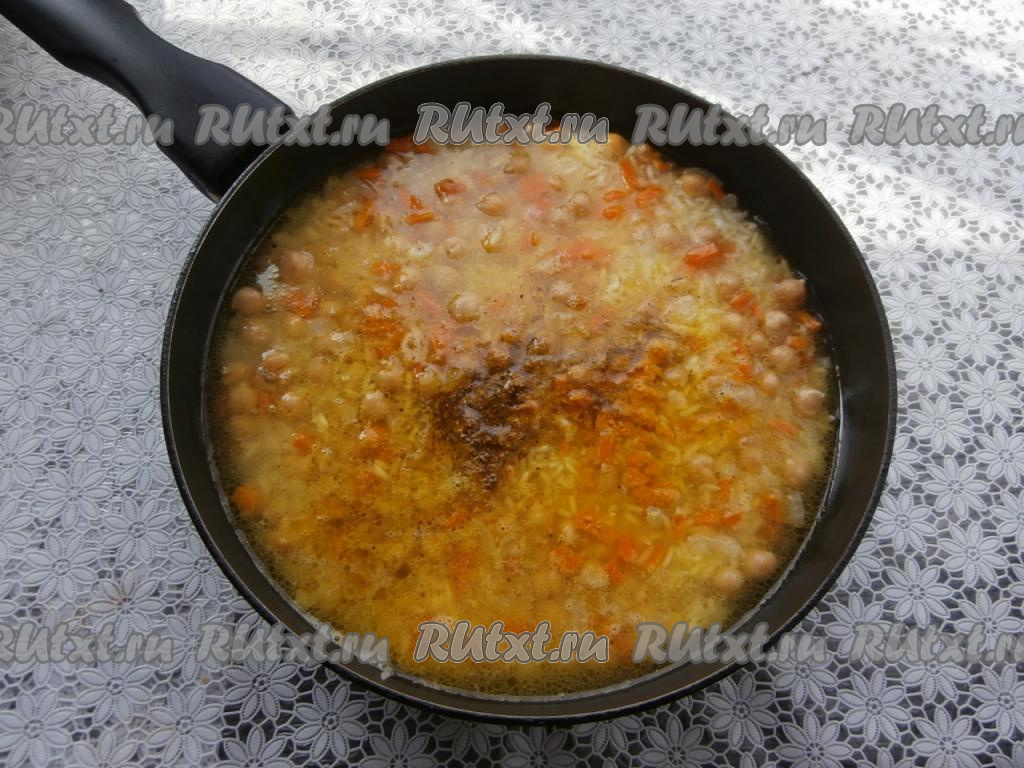 Рис с овощами и нутом перемешать, влить 3 стакана горячей воды (воду нужно отмерять тем же стаканом, которым вы отмеряли рис), добавить соль, специи, карри, чёрный молотый перец и куркуму, перемешать.