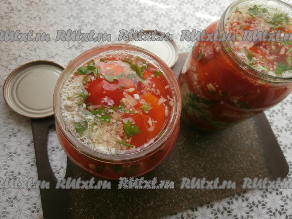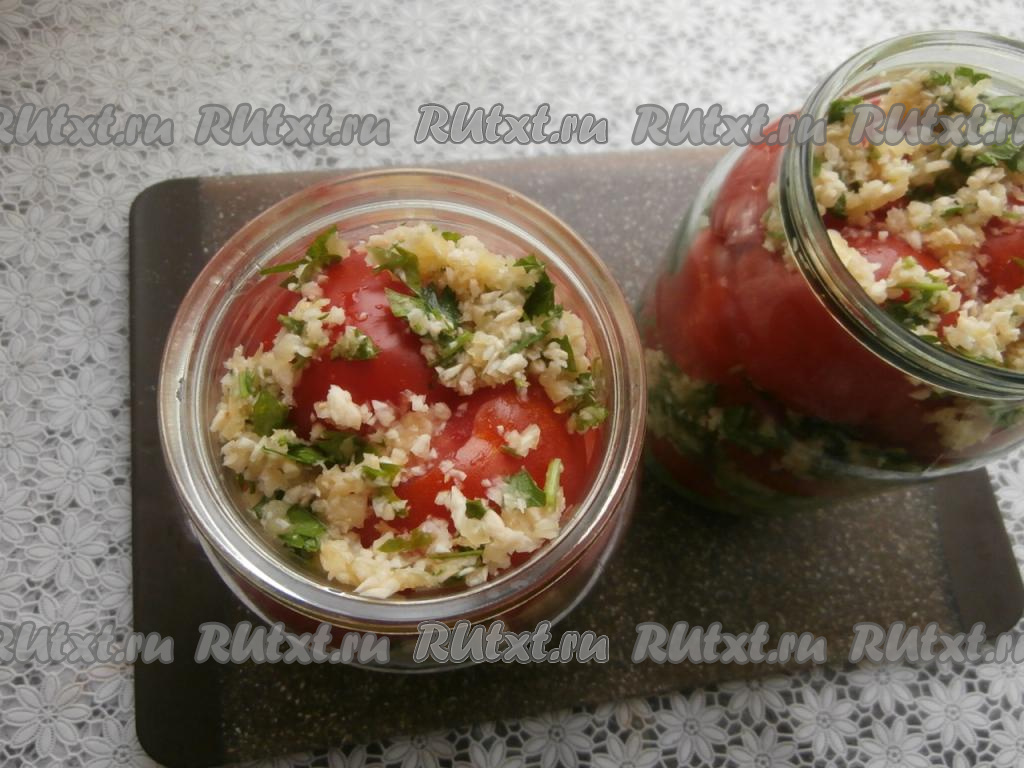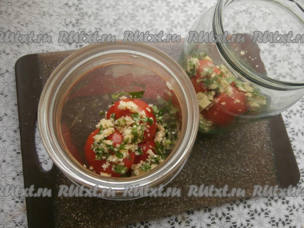 В простерилизованные банки слоями выкладывать половинки помидорчиков разрезом вниз, пересыпая их смесью из хрена и петрушки.