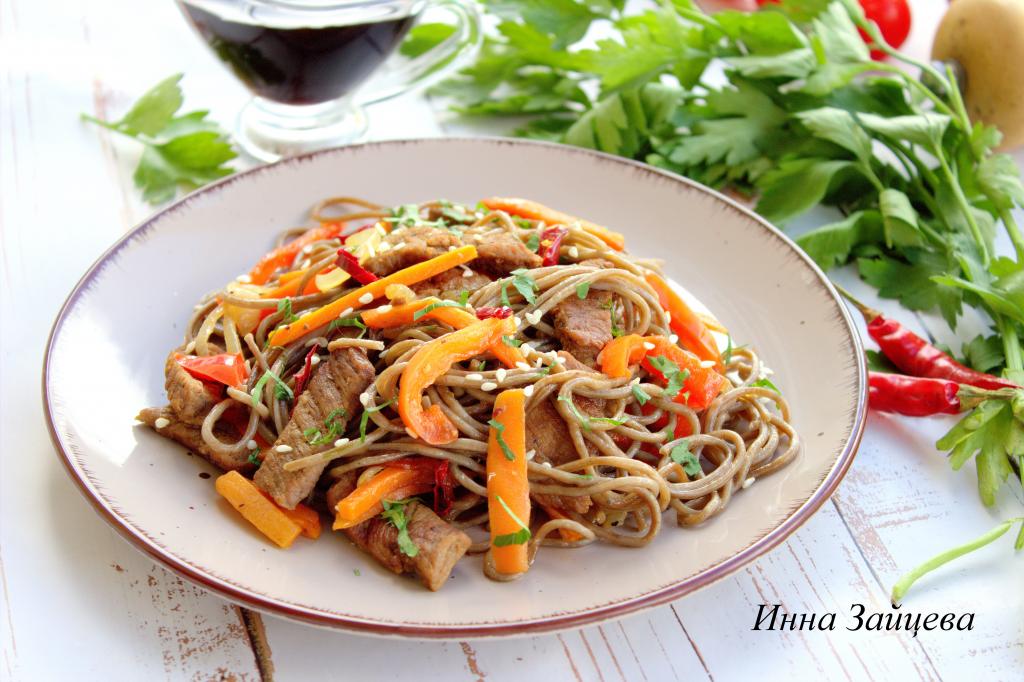 С любителями восточной кухни сегодня хочу поделиться рецептом приготовления наивкуснейшей гречневой лапши с говядиной и овощами. Гречневую лапшу можно взять любого производителя. Я использовала лапшу "SOВА". Блюдо получается невероятно сытным и очень вкусным. Овощи прекрасно дополняют лапшу и вносят определенную нотку пикантности. А обжаренная в соевом соусе говядина делает блюдо особенно аппетитным. Приготовив это блюдо хотя бы один раз, вы будете возвращаться к этому рецепту вновь и вновь.