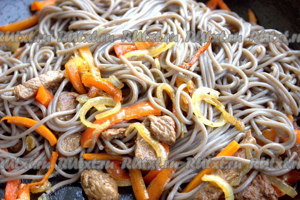 Далее в сковороду к луку, моркови и перцу с говядиной выложить гречневую лапшу. Для любителей поострее можно добавить мелко нарезанный жгучий перчик. Гречневую лапшу с овощами перемешать и прогреть на среднем огне в сковороде минуты 3, не забывая помешивать.