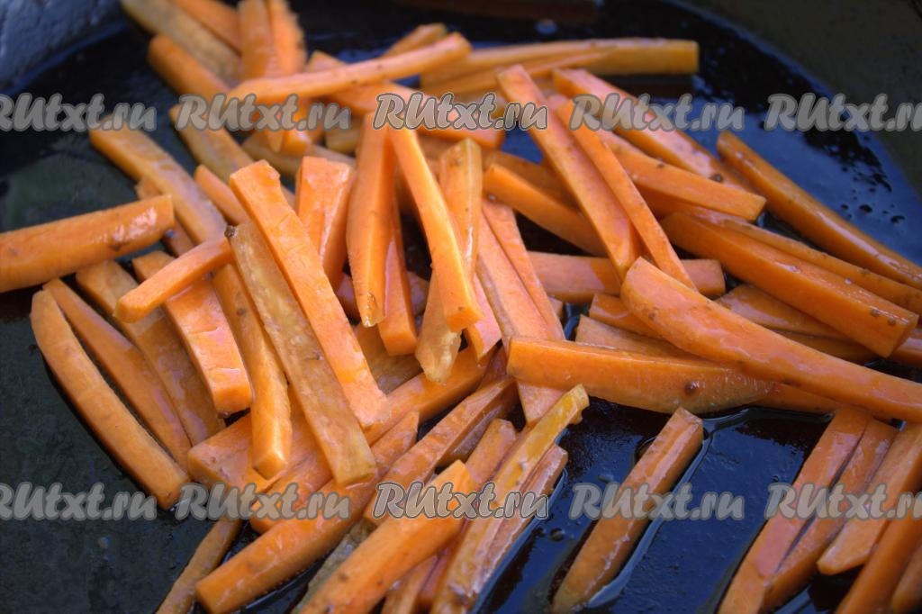 В ту же сковороду, в которой обжаривалась говядина, выложить брусочки моркови. Обжарить морковку на среднем огне до мягкости, не забывая помешивать.
