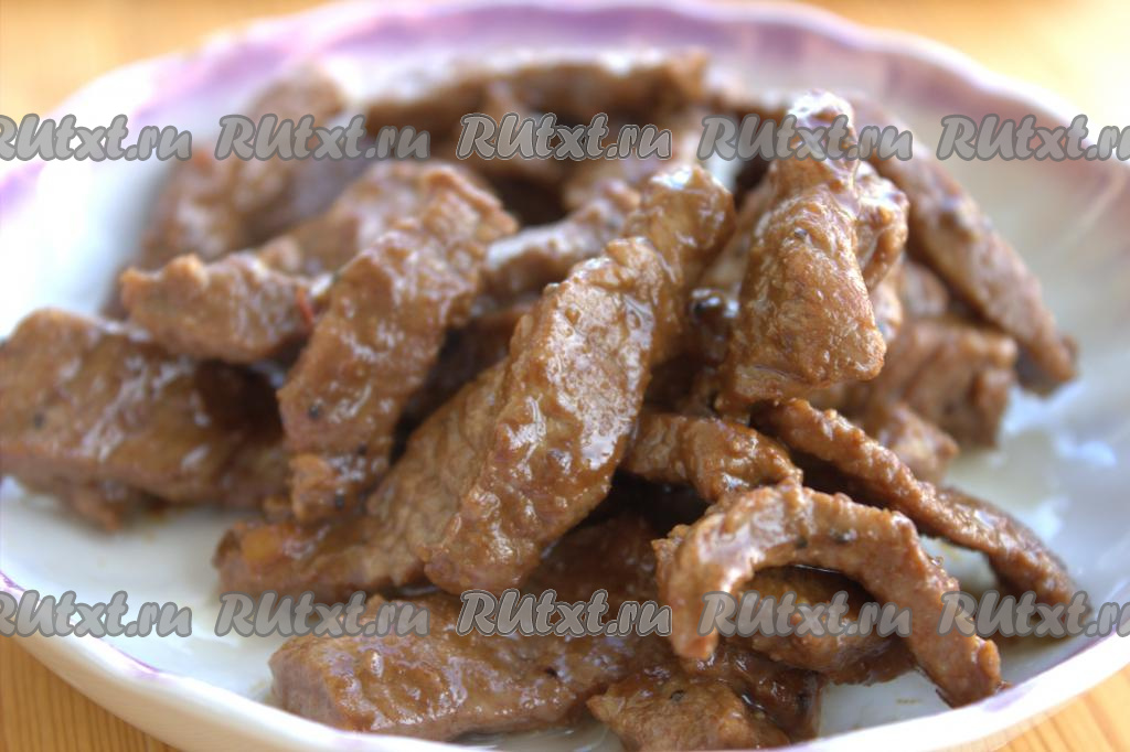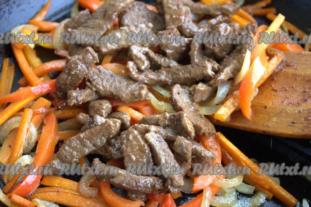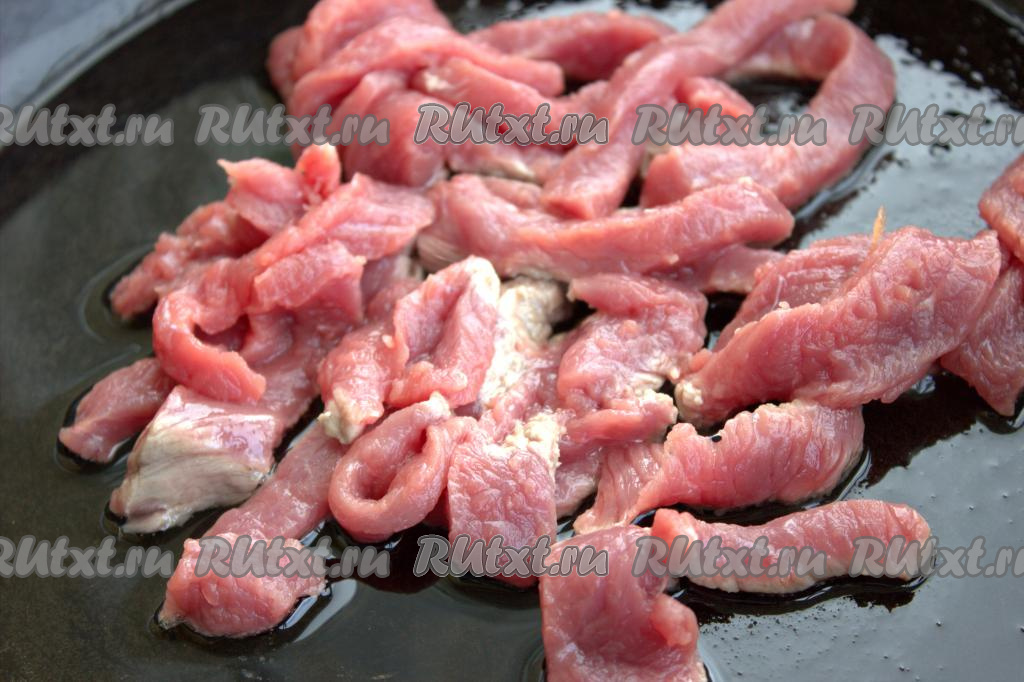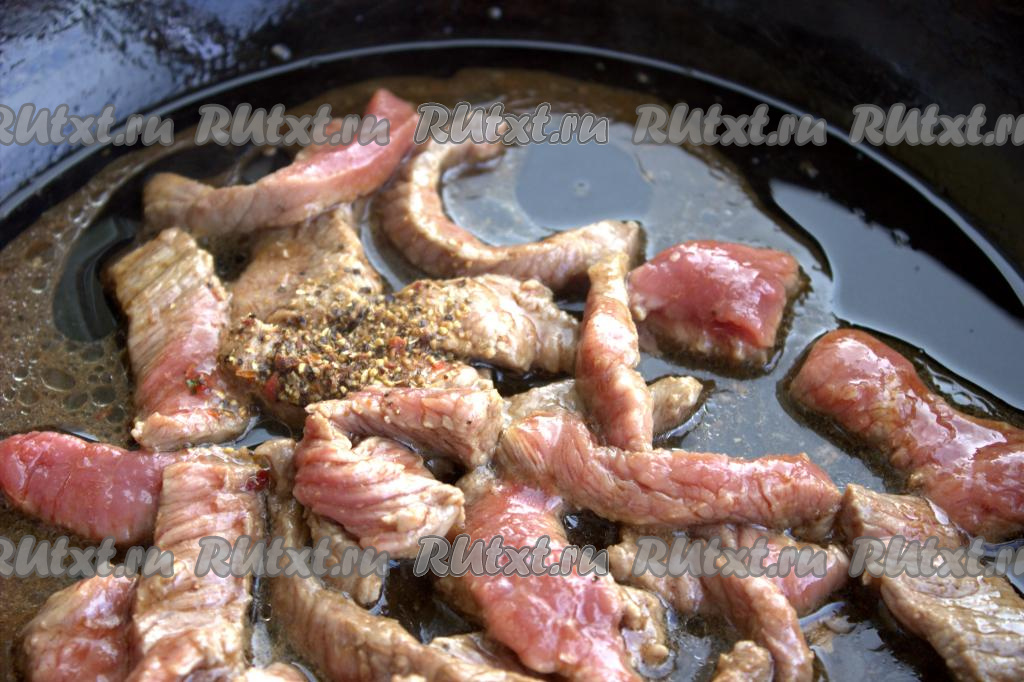 Готовые обжаренные полоски говядины переложить со сковороды на отдельную тарелку.