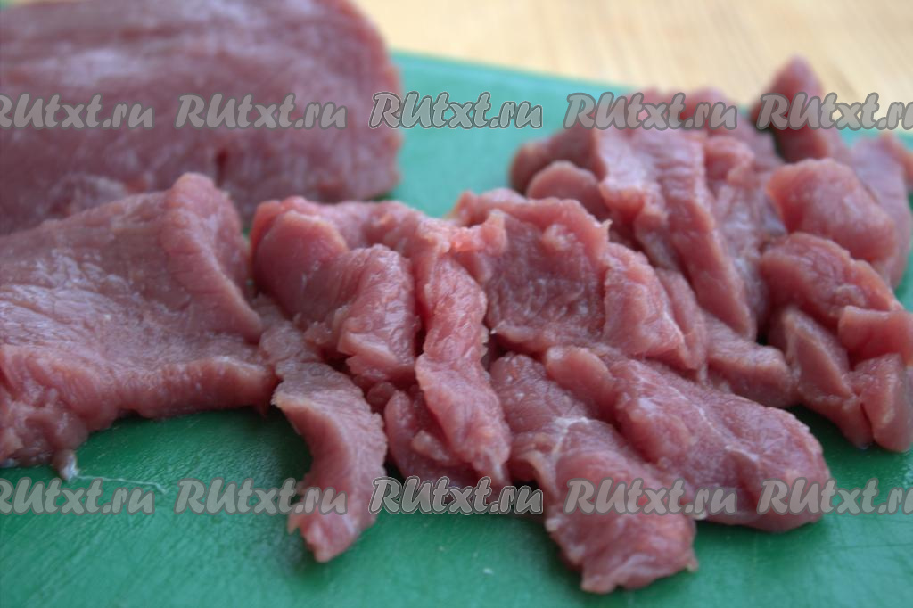 Говядину вымыть, обсушить и нарезать на тонкие, продолговатые полосочки.