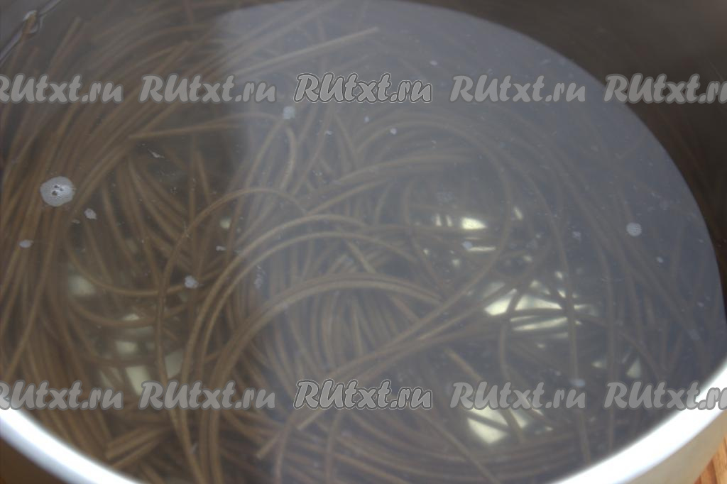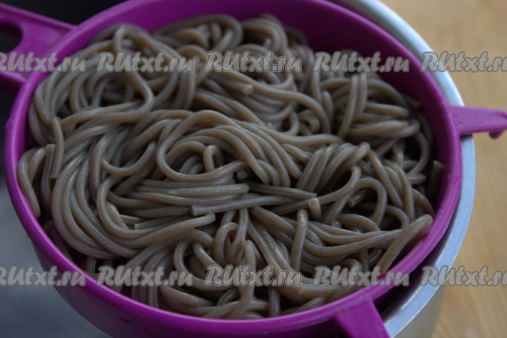 Готовую гречневую лапшу откинуть на дуршлаг, чтобы стекла лишняя вода.