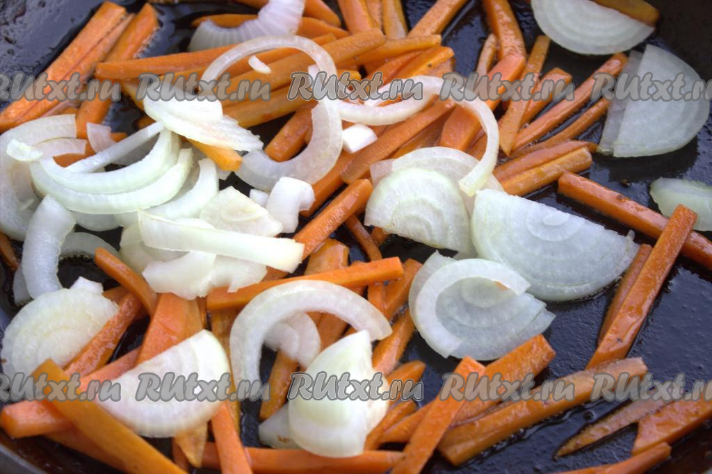 Далее в сковороду к моркови добавить нарезанный лук, хорошо перемещать и обжаривать овощи, периодически помешивая, минуты 2-3.