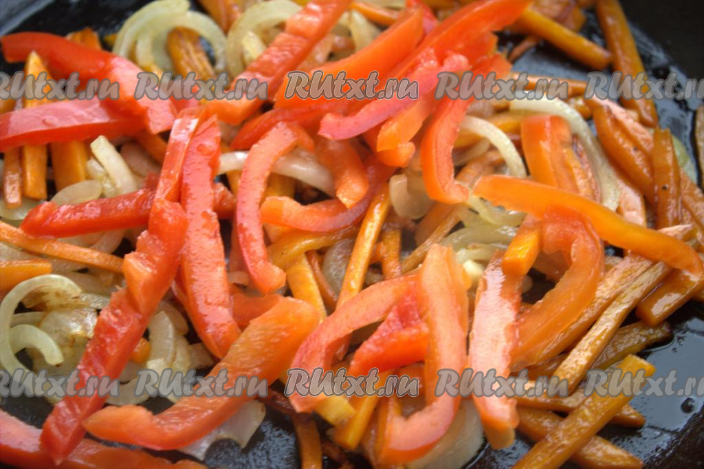 Болгарский перец очистить от плодоножки, семечек и перегородок, нарезать на тонкие полоски и выложить к морковке с луком, перемешать и обжаривать на среднем огне минуты 3-4, постоянно помешивая. По желанию, овощи можно посолить.