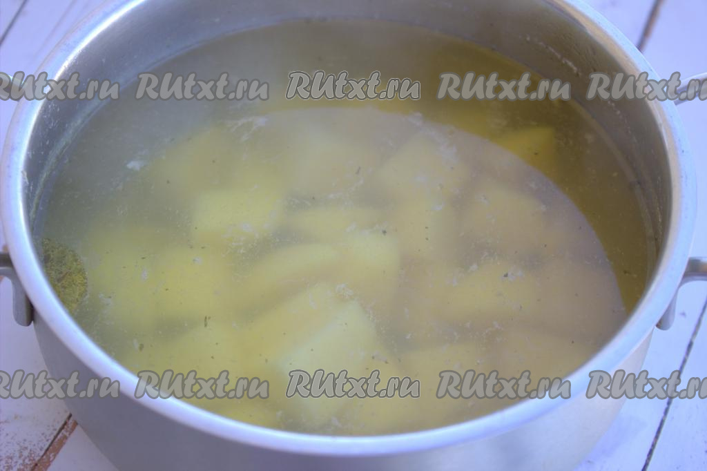 Нарезать очищенный картофель на небольшие кусочки, выложить его в кастрюлю с куриным бульоном, после закипания варить на небольшом огне минут 10 (до полуготовности картошки).