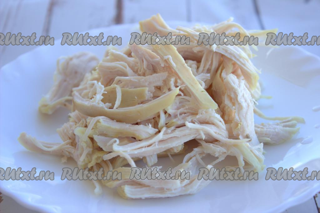 Из кастрюли вынуть курицу, дать немного остыть, затем отделить мясо от кости. Куриное мясо порвать на волокна.