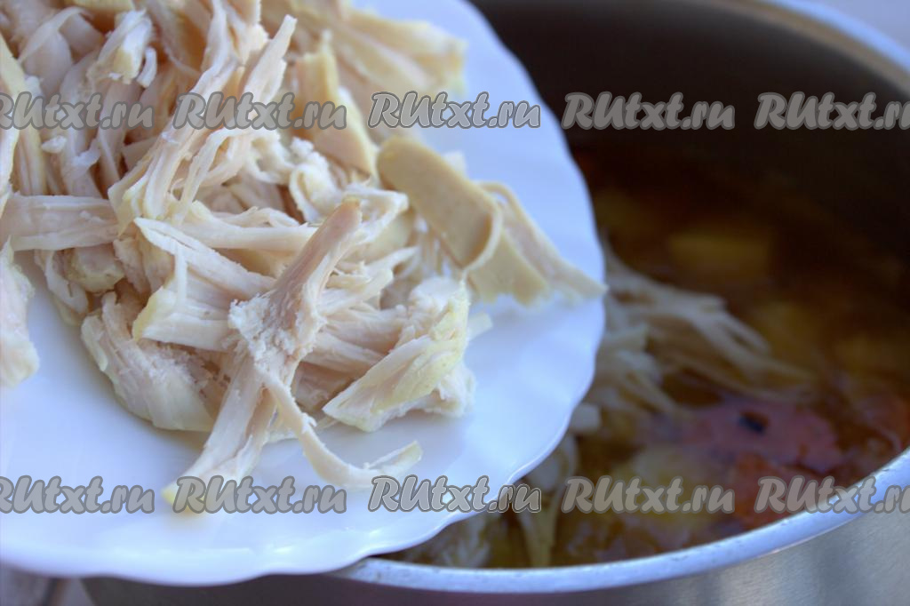 Сразу же в кастрюлю с овощами добавить разобранную на волокна курицу, после закипания варить на небольшом огне до полной готовности овощей (овощи должны легко прокалываться вилкой или ножом). Кастрюлю с куриным супом снять с огня, удалить лавровый лист.
