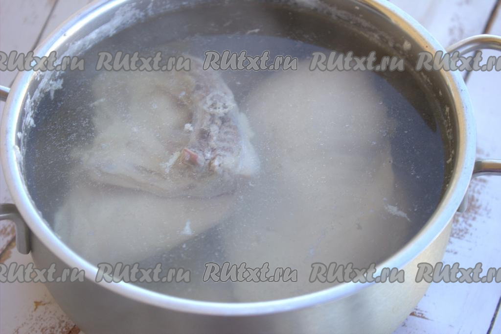 Куриное мясо вымыть, поместить в кастрюлю (я использовала одно куриное бедро и одно филе), влить 2 литра воды. Поставить кастрюлю с куриным мясом на огонь. После закипания воды уменьшить огонь до минимума, снимая образовавшуюся пену. Бульон слегка посолить и варить курицу до полной готовности (минут 40-45, готовое куриное мясо должно легко отделяться от кости).