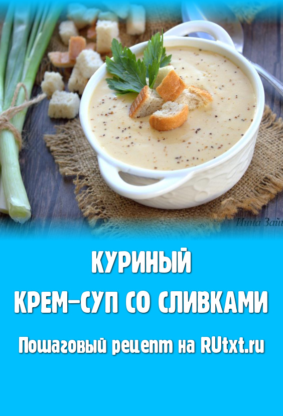 Куриный крем-суп со сливками - это вкусное, сытное и полезное первое блюдо для всей семьи. Готовится достаточно просто, из вполне доступных продуктов. Сливки можно подобрать любой жирности (чем более жирными будут сливки, тем более калорийным получится супчик). Приготовьте крем-суп по этому рецепту и вам обязательно понравится его нежный вкус и аромат!