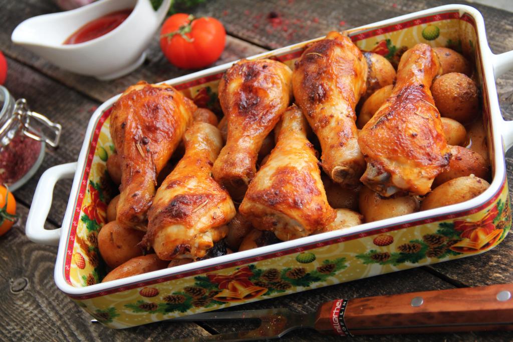 Аппетитные, сочные куриные ножки вместе с ароматной молодой картошкой достать из духовки и подать к столу в горячем виде, дополнив, по желанию, свежими овощами и зеленью.