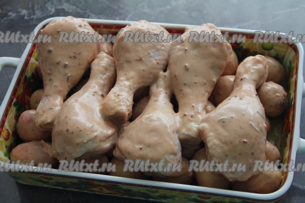 Поверх картошки выложить куриные ножки.