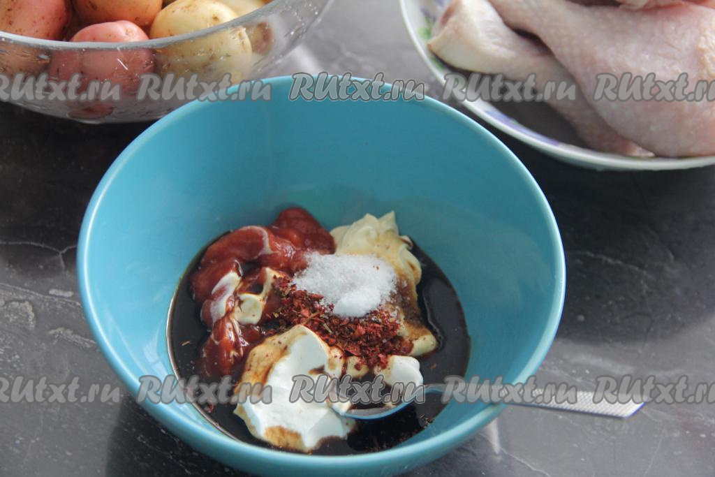 Для получения маринада соединить в миске сметану, майонез, томатную пасту и соевый соус, всыпать соль и приправу для курицы.