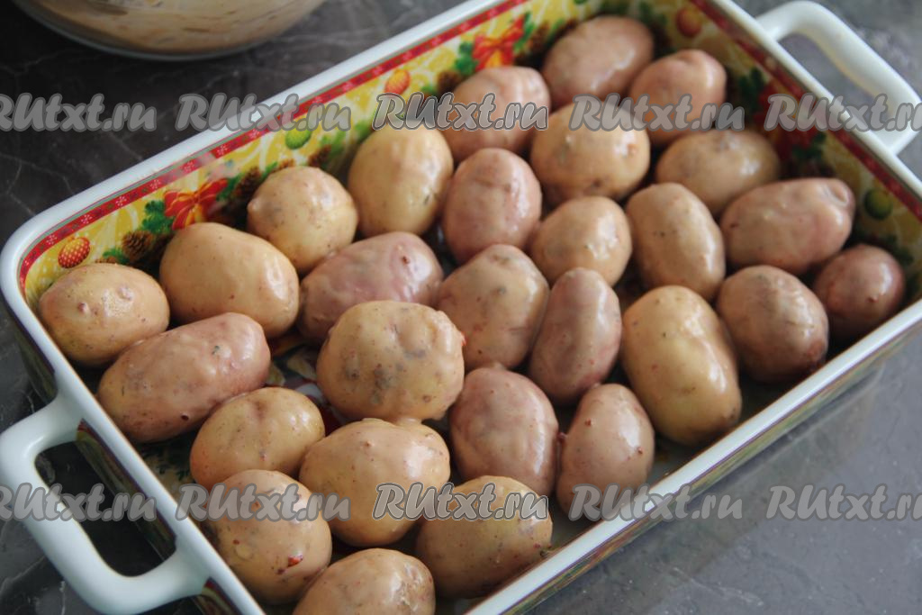 Затем к куриным ножкам в маринаде выложить молодую картошку. У меня была мелкая молодая картошка, поэтому я добавила её целиком. Если у вас картофель крупный, тогда разрежьте его на части.