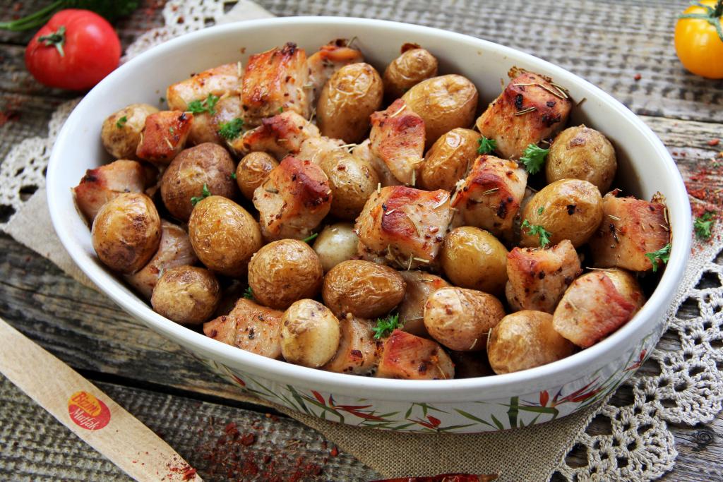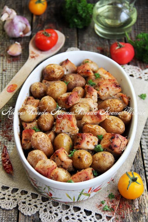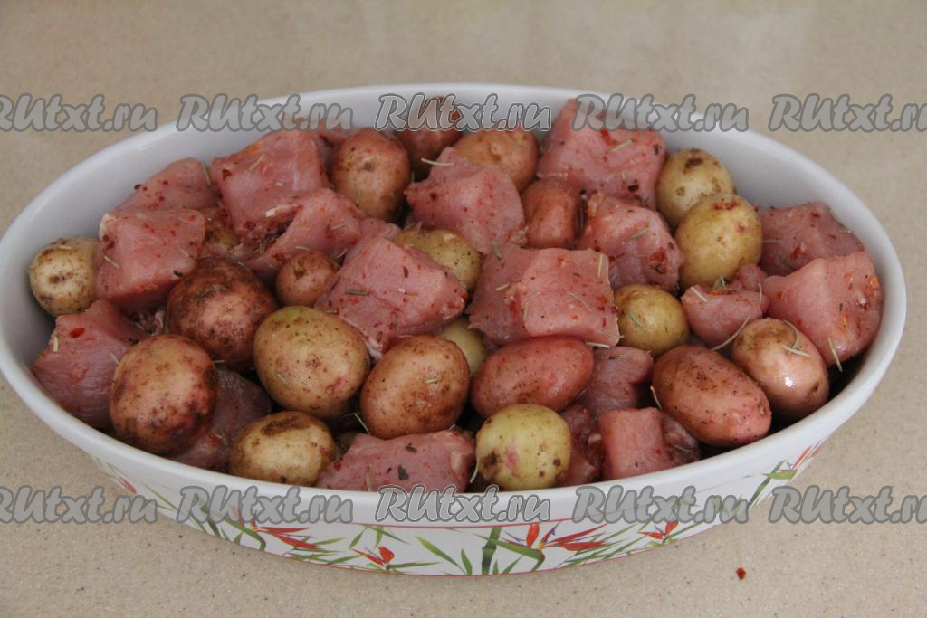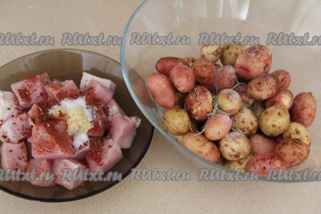 Предлагаю запечь в духовке молодой картофель со свининой. В этом блюде мы будем готовить одновременно гарнир вместе с мясом. Получается очень вкусно, картошечка становится ароматной, с аппетитной корочкой снаружи и мягкой внутри, а свинина - нежнейшей, чем-то напоминает шашлык.