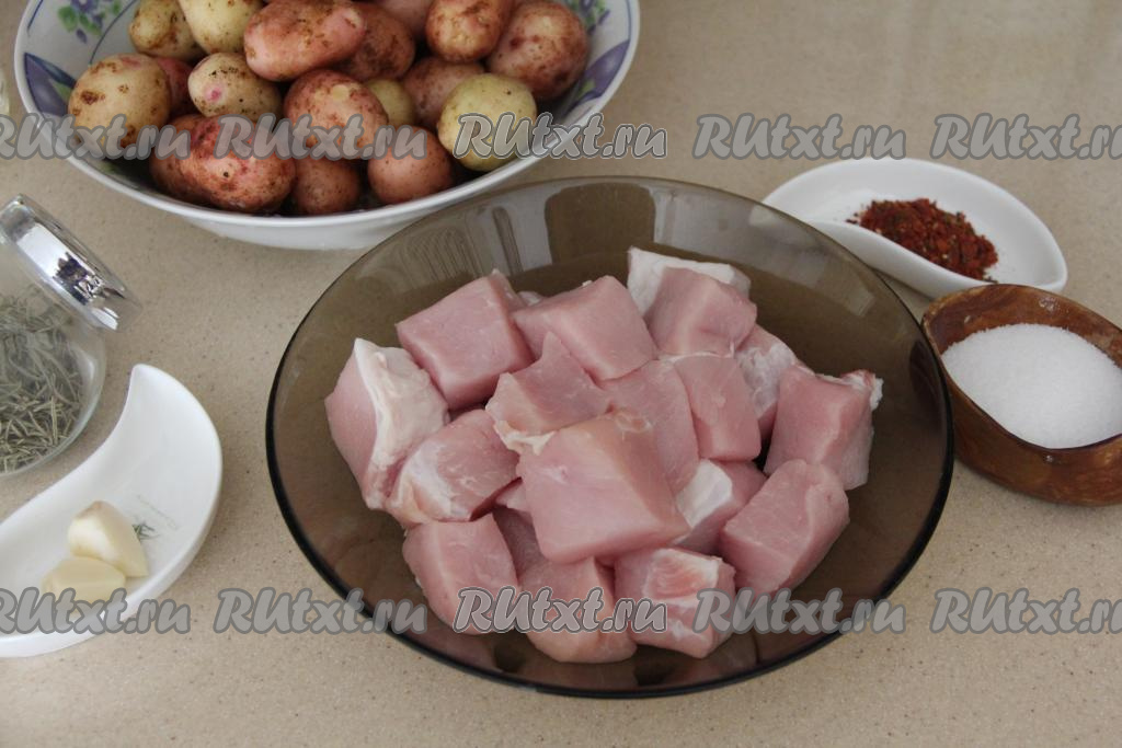 Молодую картошку хорошо вымыть щёткой, кожуру можно не счищать. Если молодая картошка крупная, тогда нарежьте её на примерно равные дольки. Свинину нарезать на кусочки размером 5 на 5 сантиметров.
