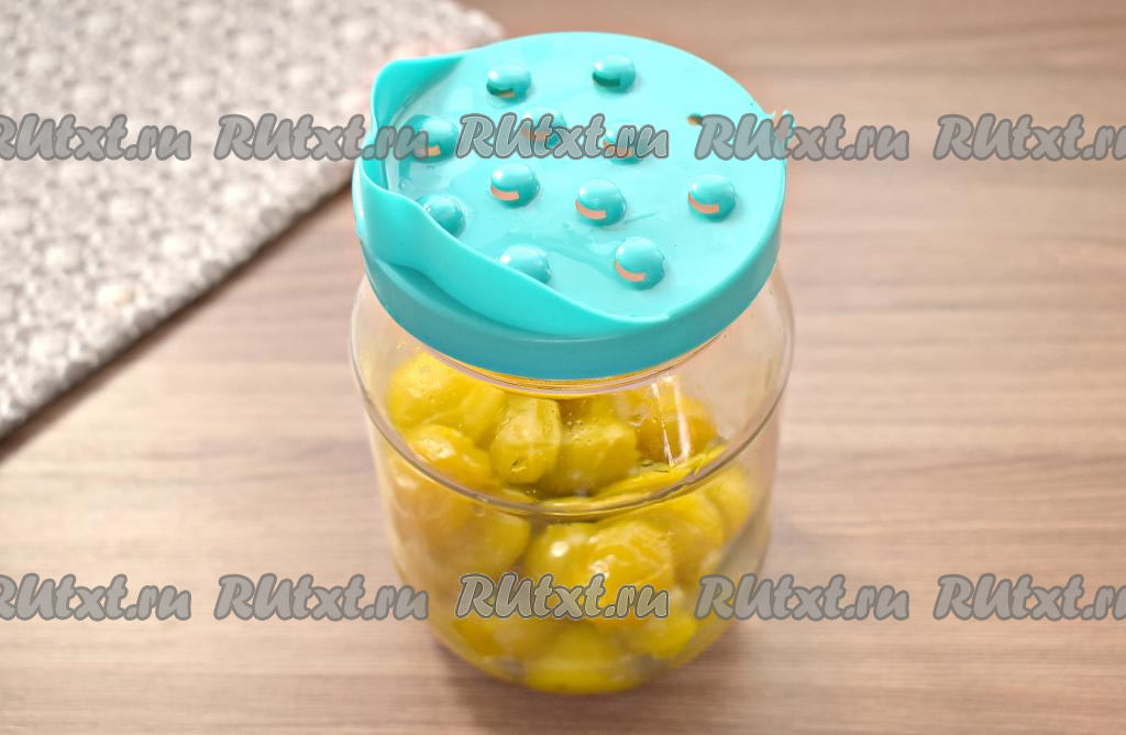Вливаем в банку со сливами кипяток, заполняя баночку водой до самого верха. Банку сразу накрываем крышкой и оставляем так на 15 минут.
