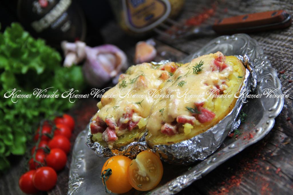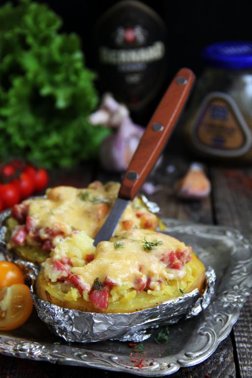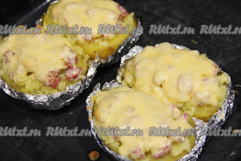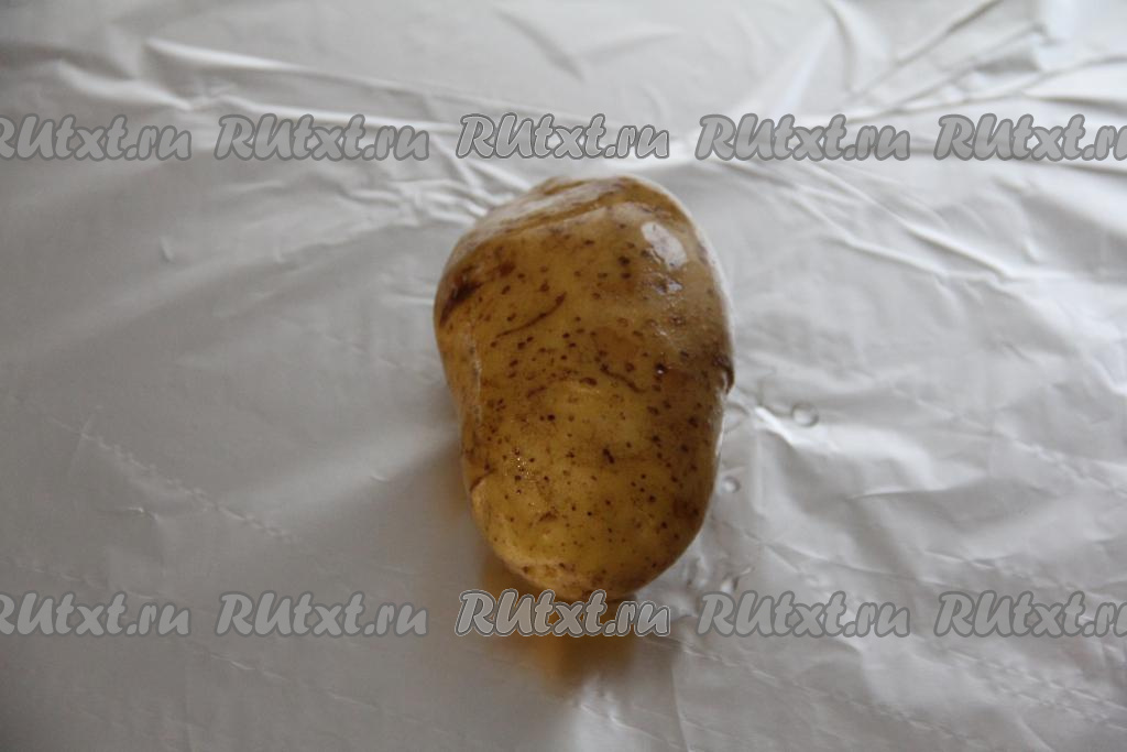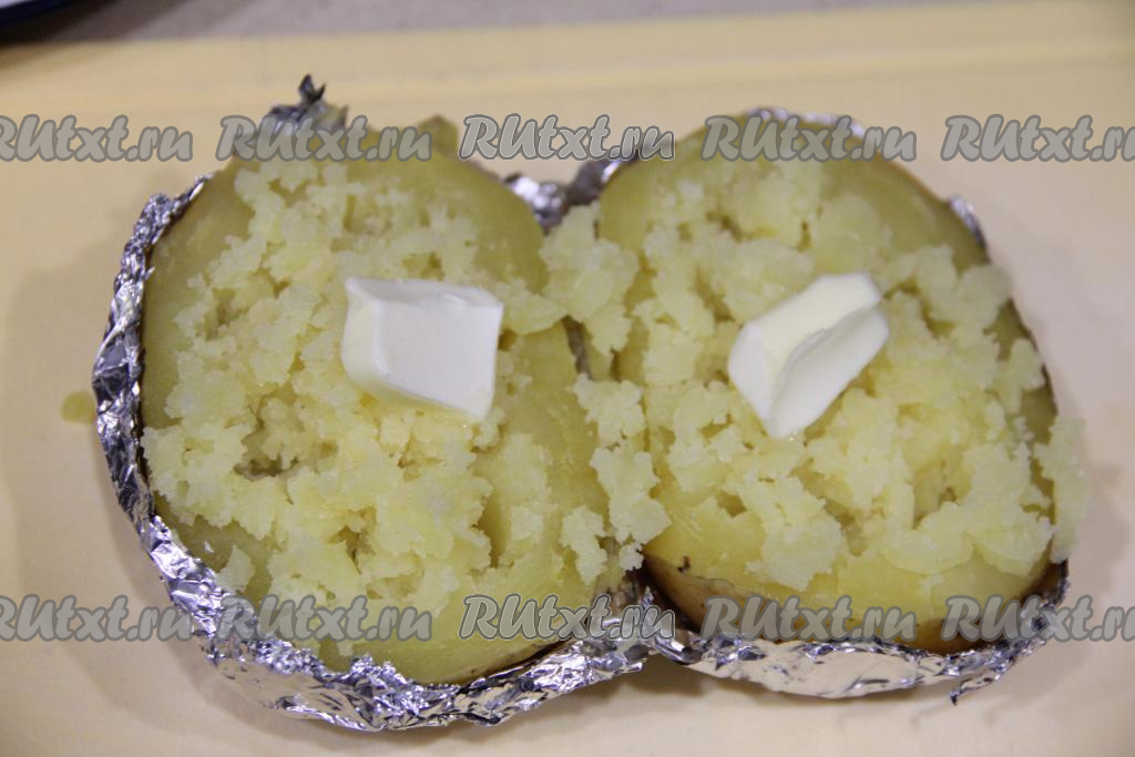 Вначале одну картошину смазать со всех сторон растительным маслом и плотно завернуть в фольгу. Затем вторую картошину тоже смазать маслом и завернуть плотно в фольгу. Переложить завёрнутые картофелины в форму для запекания и отправить в хорошо разогретую духовку. Запекать картошины в фольге при температуре 200 градусов минут 40. Время запекания зависит от размера и сорта картошки. Готовность легко проверить, проткнув завёрнутую в фольгу картошку вилкой (если вилка легко входит в картофель, значит доставайте его из духовки).