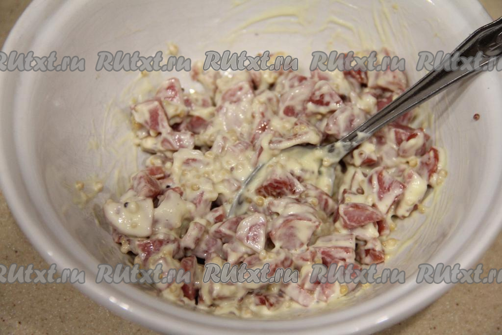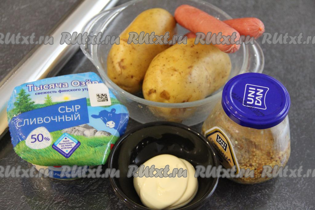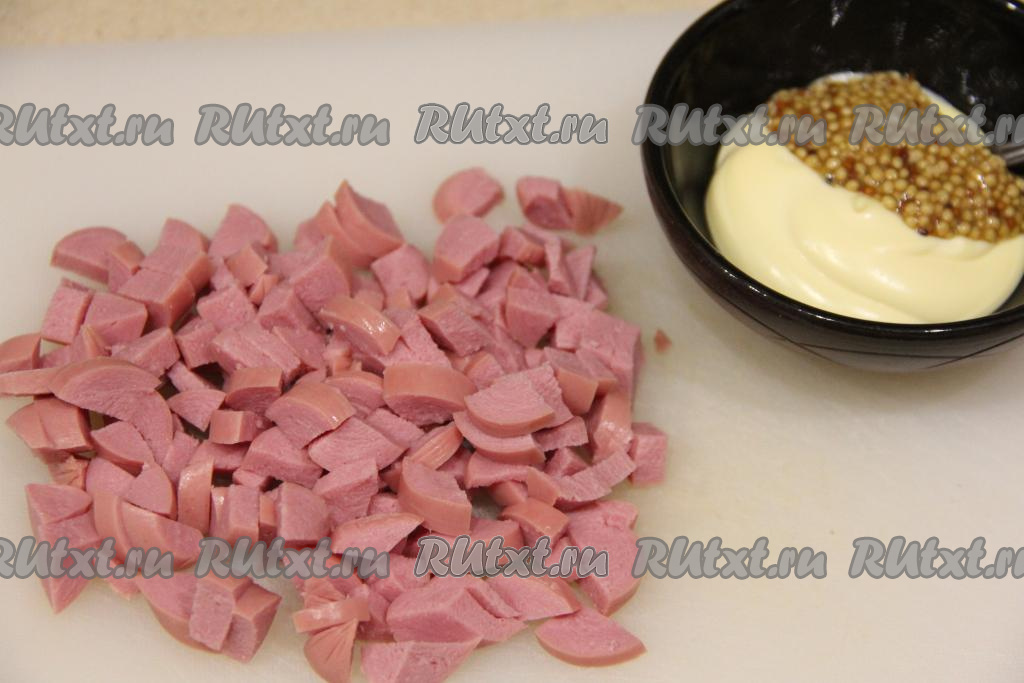 Пока картошка запекается, нужно приготовить начинку для крошки-картошки. Для этого сосиски, очищенные от слюды, нарезать на средние кусочки. В небольшой ёмкости соединить майонез и горчицу (я использовала зерновую горчицу, но можно взять обычную горчицу), перемешать.