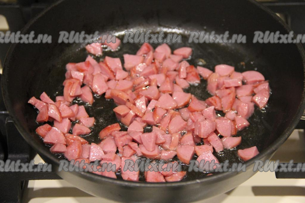 В сковороду влить немного растительного масла и выложить нарезанные сосиски. Обжарить сосиски на среднем огне, помешивая, до золотистого цвета, затем дать немного остыть.