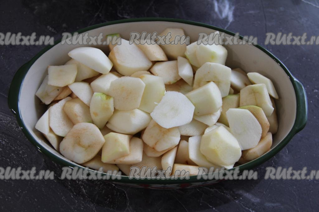 Яблоки почистить, удаляя семечки и кожуру. 500 грамм очищенных яблок нарезать на небольшие кусочки, выложить в жаропрочную форму и накрыть фольгой. Запекать яблоки в разогретой духовке минут 35 (до мягкости) при температуре 200 градусов.