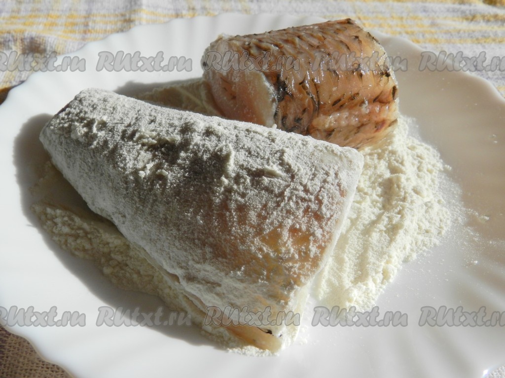 На тарелку насыпать муку,  кусочки рыбы панировать в муке.