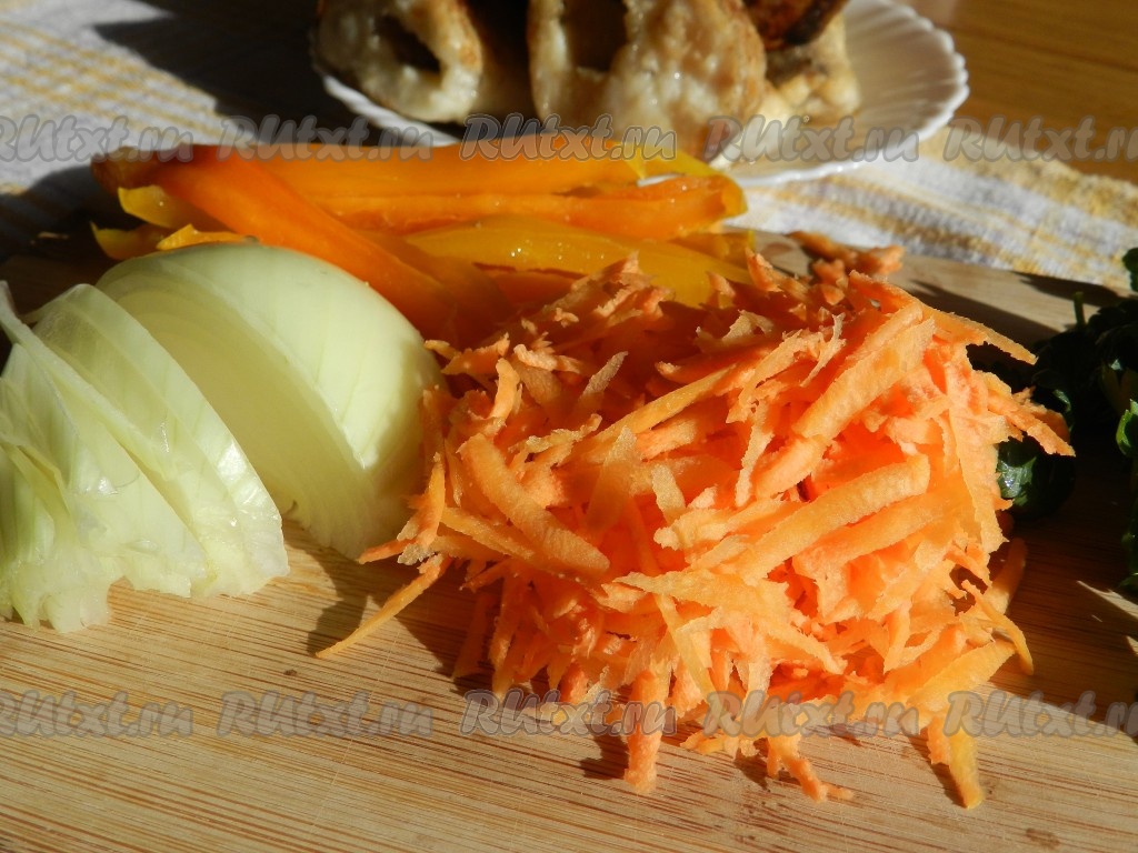 Лук и болгарский перец нарезать, морковь натереть на терке, нарезать петрушку.