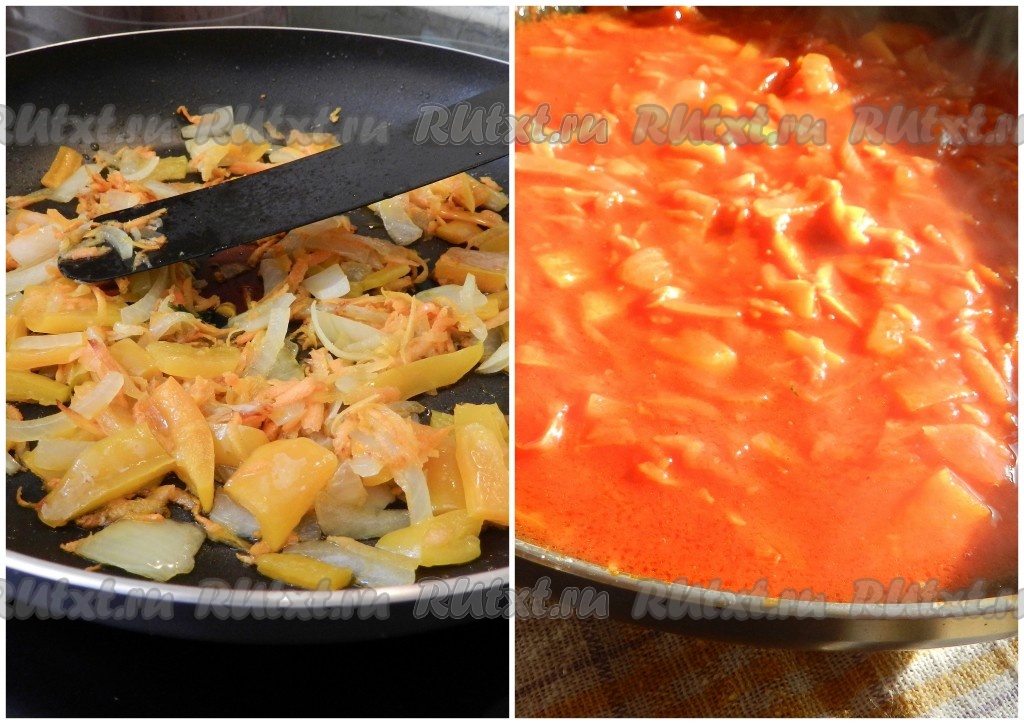 На растительном масле обжарить лук и морковь, затем добавить болгарский перец, слегка обжарить все вместе. Влить немного воды (или бульона), добавить томатную пасту, перемешать, довести до кипения.