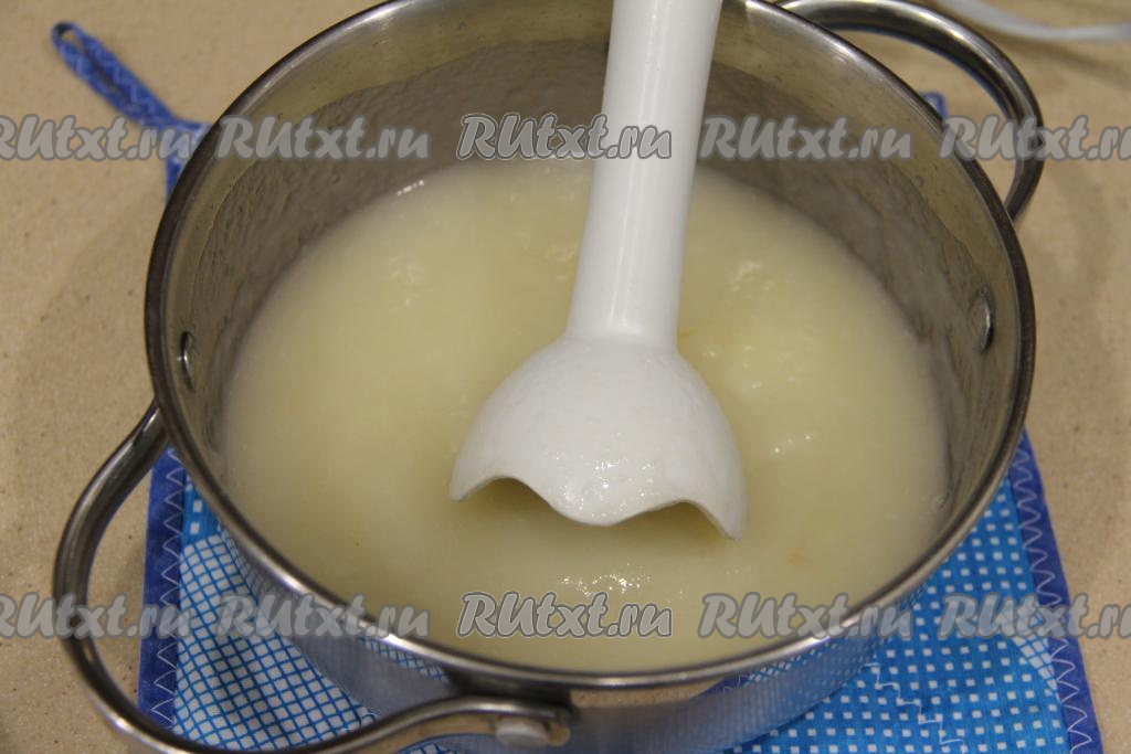Желатин залить 50 миллилитрами холодной воды и оставить набухать минут на 10-15. Затем прогреть желатиновую смесь на среднем огне, помешивая, до растворения кристалликов желатина. Главное - не дать желатиновой смеси закипеть. Затем желатиновую смесь добавить в яблочную массу, перемешать миксером.
