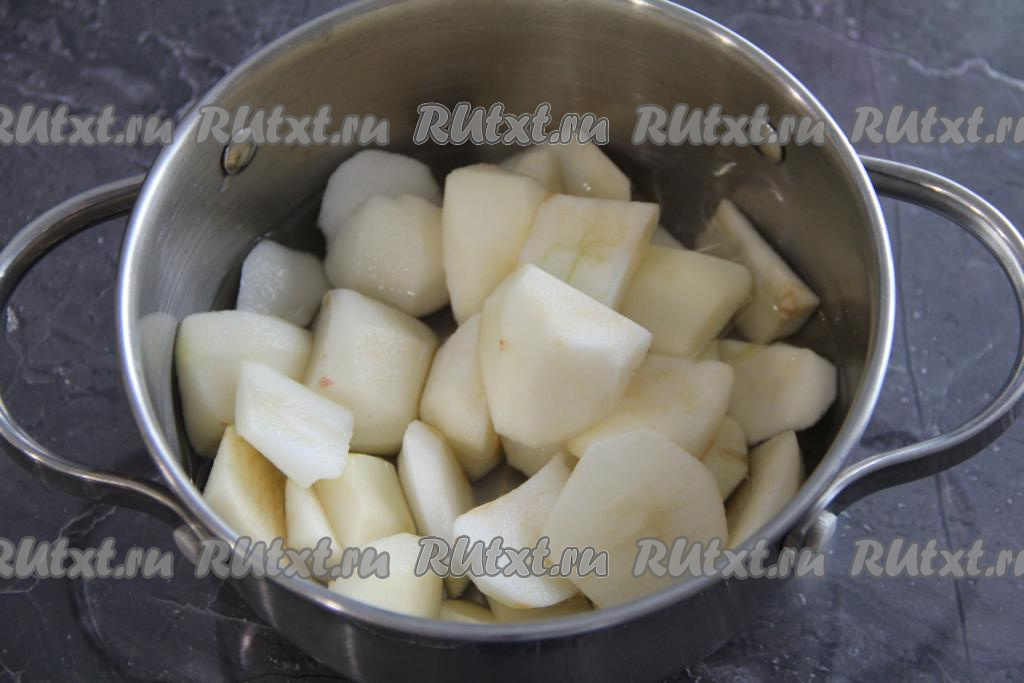 Яблоки очистить от кожуры и семечек. Для приготовления желе нам понадобится 250 грамм очищенных яблок. Нарезать яблоки на небольшие дольки, выложить в кастрюлю, влить 150 миллилитров воды и поставить на огонь.