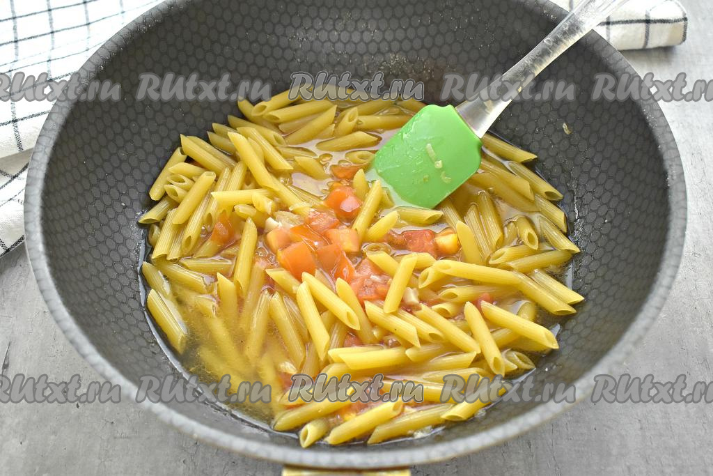 Макароны заливаем кипятком, перемешиваем. Доводим содержимое сковороды до кипения, накрываем крышкой и убавляем огонь до минимума. Тушим макароны с помидорами и луком около 10-12 минут.
