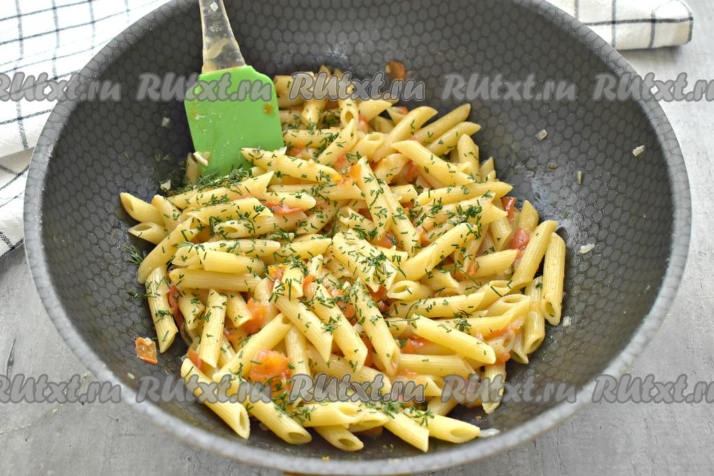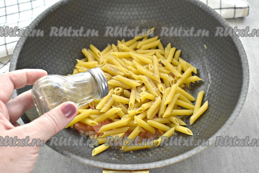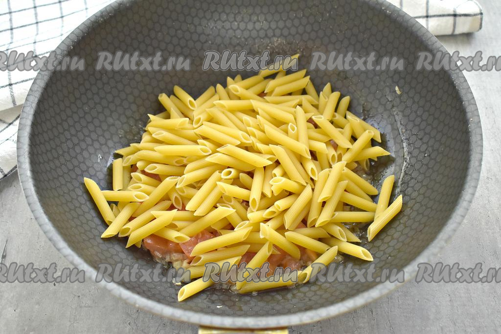 Затем на сковороду с помидорами и луком высыпаем макароны.
