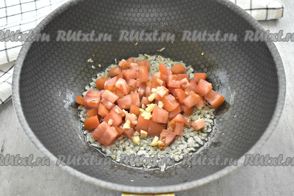 К луку добавляем нарезанный на кусочки помидор и мелко порубленные зубчики чеснока, перемешиваем, обжариваем минуты 4, помешивая.