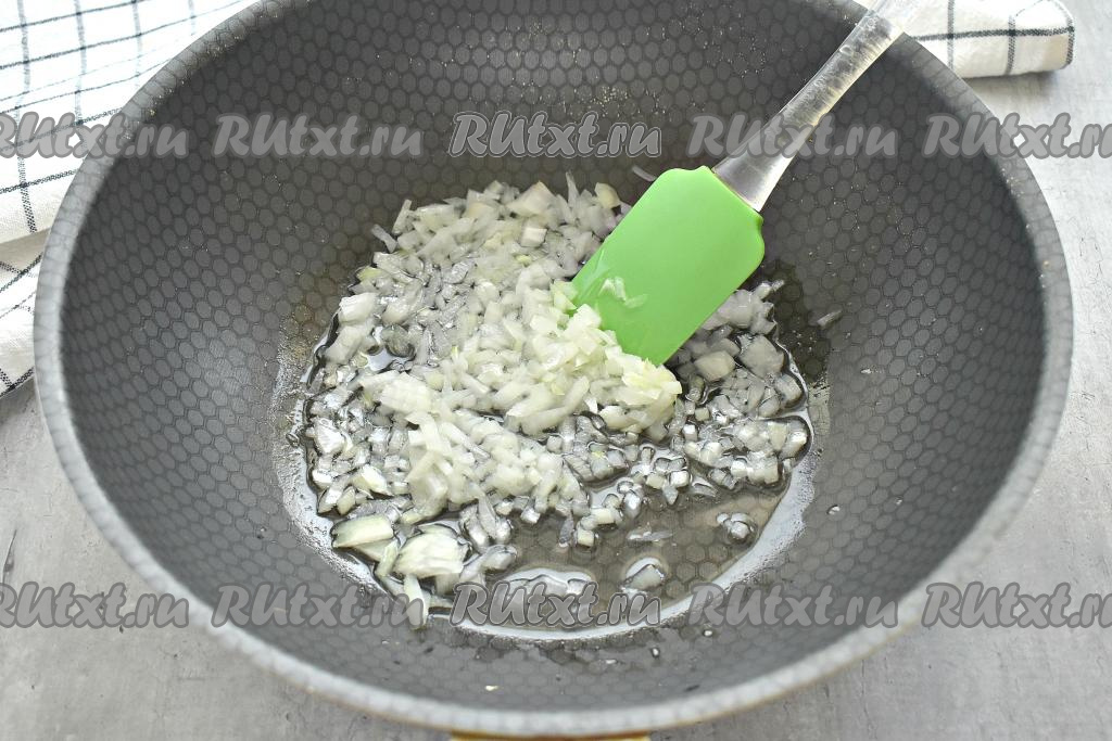 Лук нарезаем мелко и перекладываем на сковороду, уже разогретую с растительным маслом. На среднем огне, периодически помешивая, обжариваем лук минут 5. Лук должен стать мягким.