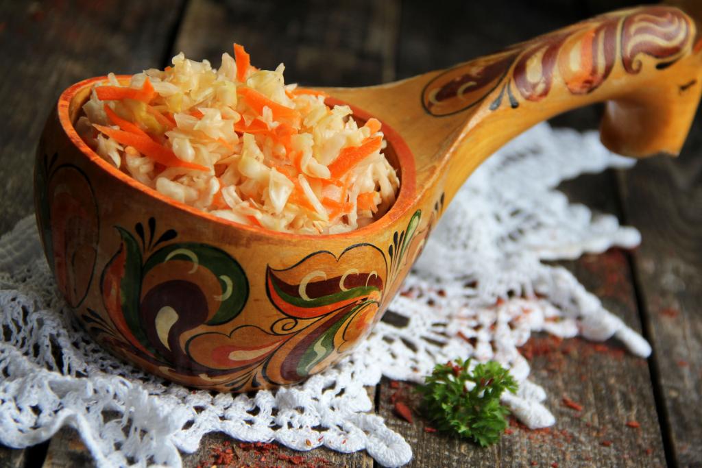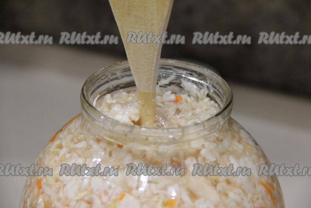 Банку поставить в глубокую тарелку, так как капуста начнёт бродить и будет выделяться сок. Оставить капусту в банке кваситься на 2-3 дня на кухонном столе при комнатной температуре. Баночку сверху можно прикрыть марлей. В первые сутки выделится много сока. На поверхности появятся пузырьки. Капуста всё время должна быть покрыта соком, выделяющимся в процессе брожения. 2-3 раза в день, пока капуста квасится при комнатной температуре, нужно протыкать капусту с помощью деревянной палочки (или черенка от шумовки) в нескольких местах, доходя до дна банки, - благодаря этим действиям будет выходить воздух, а значит готовая капуста не будет горчить.