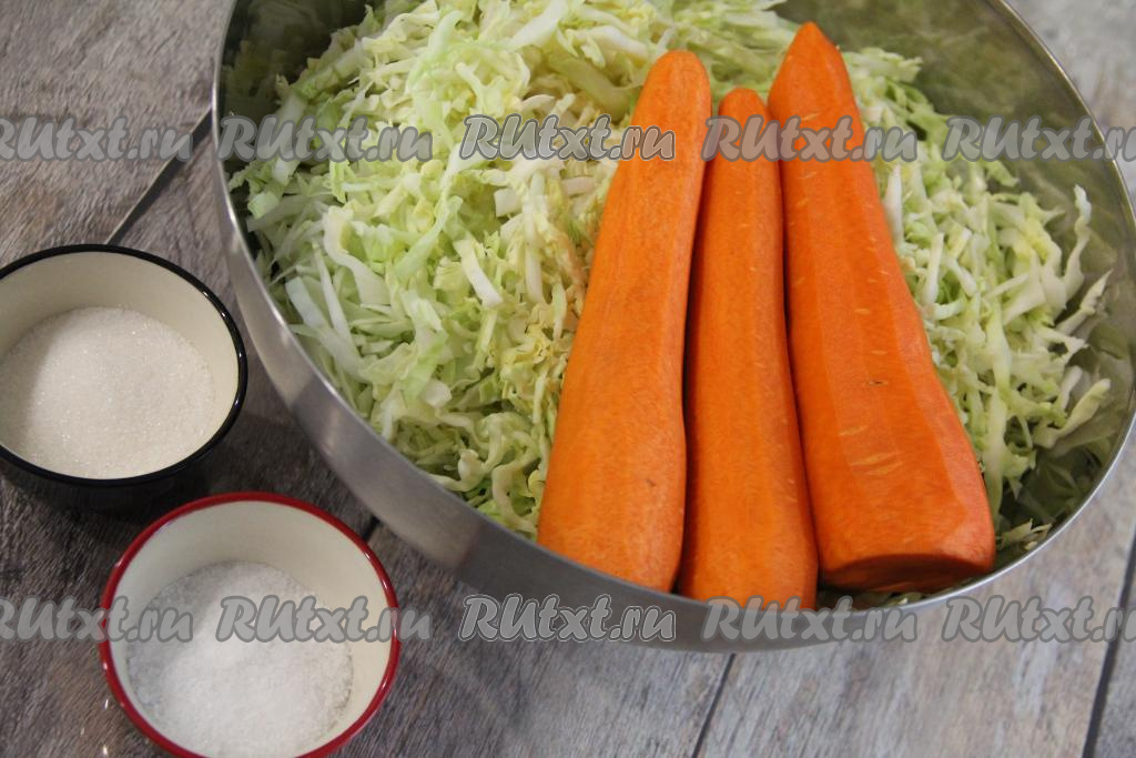 Капусту тонко нарезать, переложить в глубокую миску и хорошо помять руками. Морковь почистить.