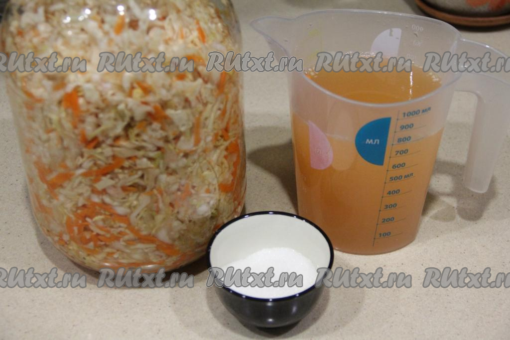 Как только капуста перестанет выделять сок, значит она готова. Продолжительность брожения зависит от температуры на кухне. У меня капуста стояла три дня. Слить весь сок из банки в отдельную ёмкость. В ёмкость с рассолом, слитым из банки, всыпать сахар и хорошо перемешать (до полного растворения сахара). Влить рассол обратно в банку и закрыть баночку капроновой крышкой. Поставить банку с квашеной капустой в холодильник на сутки.