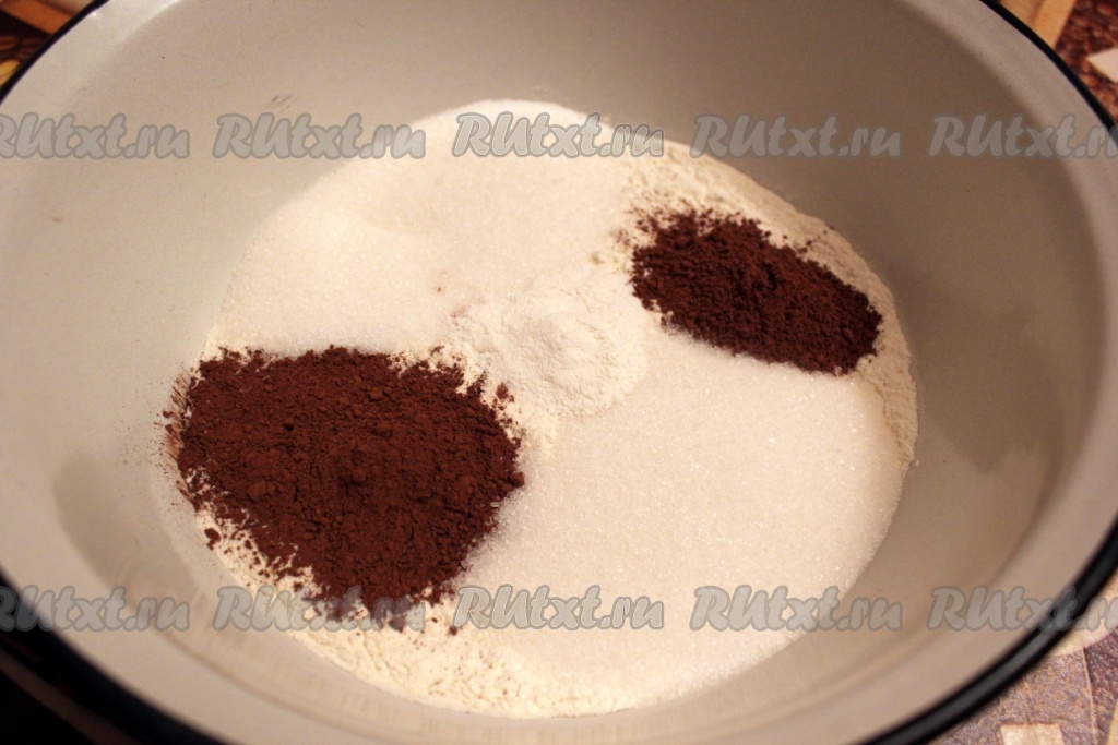 Соединить муку, сахар, какао, разрыхлитель и перемешать.