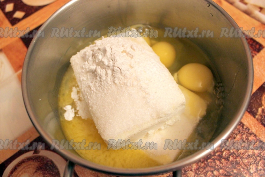 Для приготовления начинки для песочного пирога нужно соединить творог, сахар, ванильный сахар, крахмал, яйца и растопленное сливочное масло и тщательно перемешать в однородную массу.